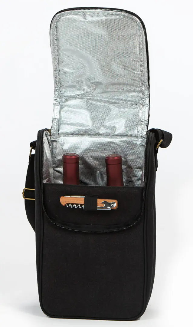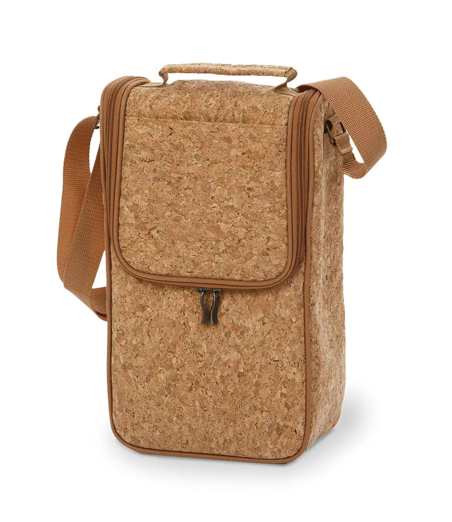 Double bottle carrier from Oak & Olive is made with soft washed canvas or genuine cork, holds 2 wine, spirit or beverage bottles. Full thermal foil insulated construction maintains beverage temperature while traveling to restaurants, parties and outings. Removable center divider securely holds 2 bottles in place and includes a wooden handle waiter’s corkscrew and adjustable shoulder strap.
