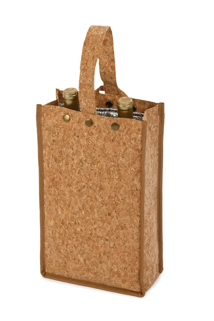 Insulated double bottle carrier with thermal foil lining and snap closure top maintains beverage temperature while in transit. Center divider with adjustable carry strap handle which converts to a take-a-long sling. Perfect size for wine, spirits, and other beverages. Washed cotton canvas or cork exterior.