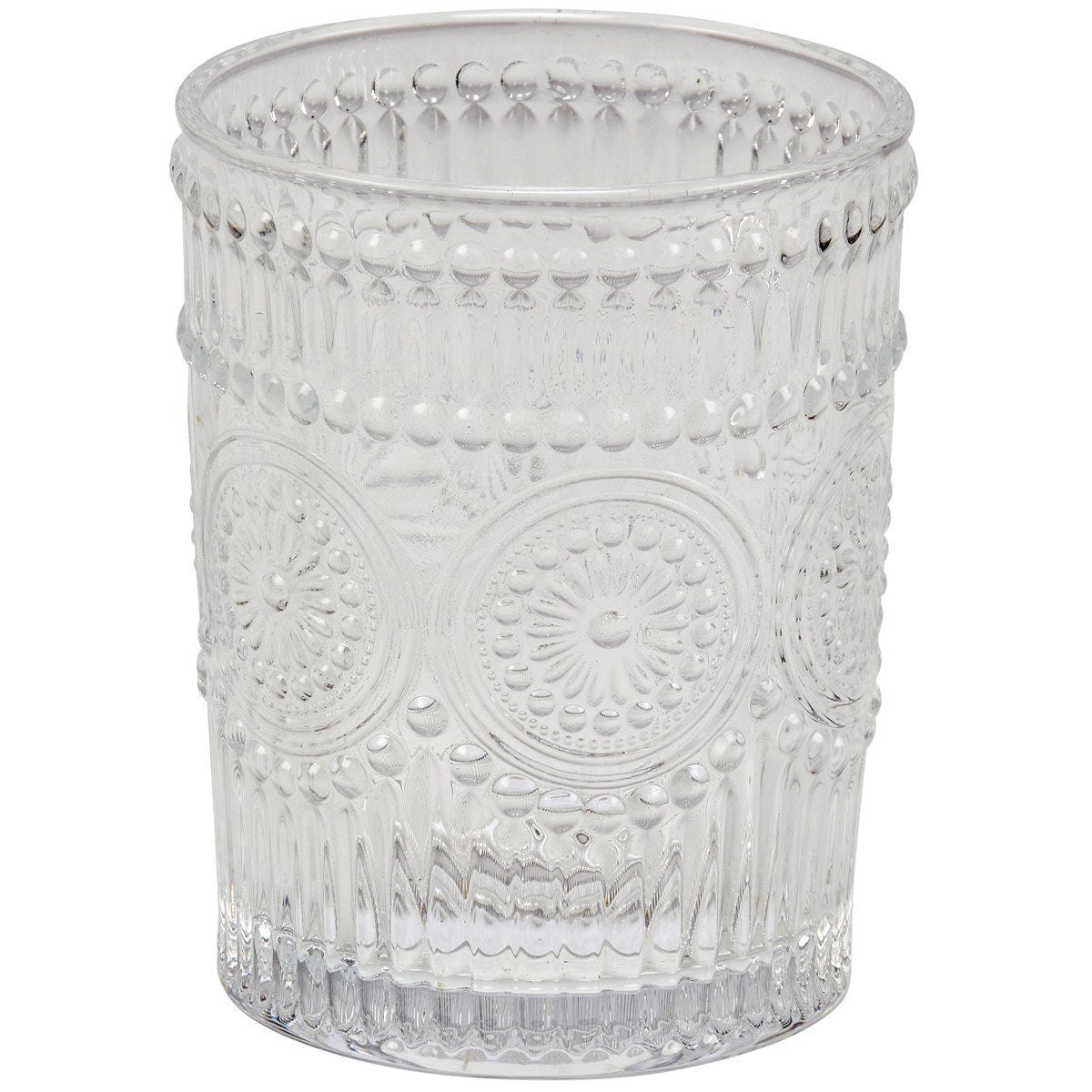 A 10 oz drinking glass displaying a vintage design with medallion motifs. Our Medallion large drinking glass coordinates well with table décor from our Cottagecore Collection. Hand wash only. A piece of rustic tableware perfect for everyday gatherings.
