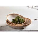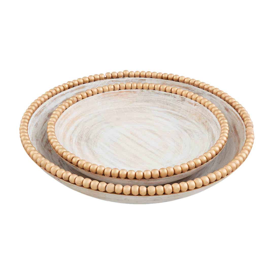 Add a touch of opulence to your home decor with our Gold Metal Beaded Bowl set today! Crafted from luxurious white-washed mango wood, this set includes two nested bowls adorned with stunning gold metal bead rims. With a sleek and sophisticated design, these bowls are the epitome of elegance.  To maintain their beauty, we recommend hand washing or cleaning with a damp cloth - please avoid soaking.