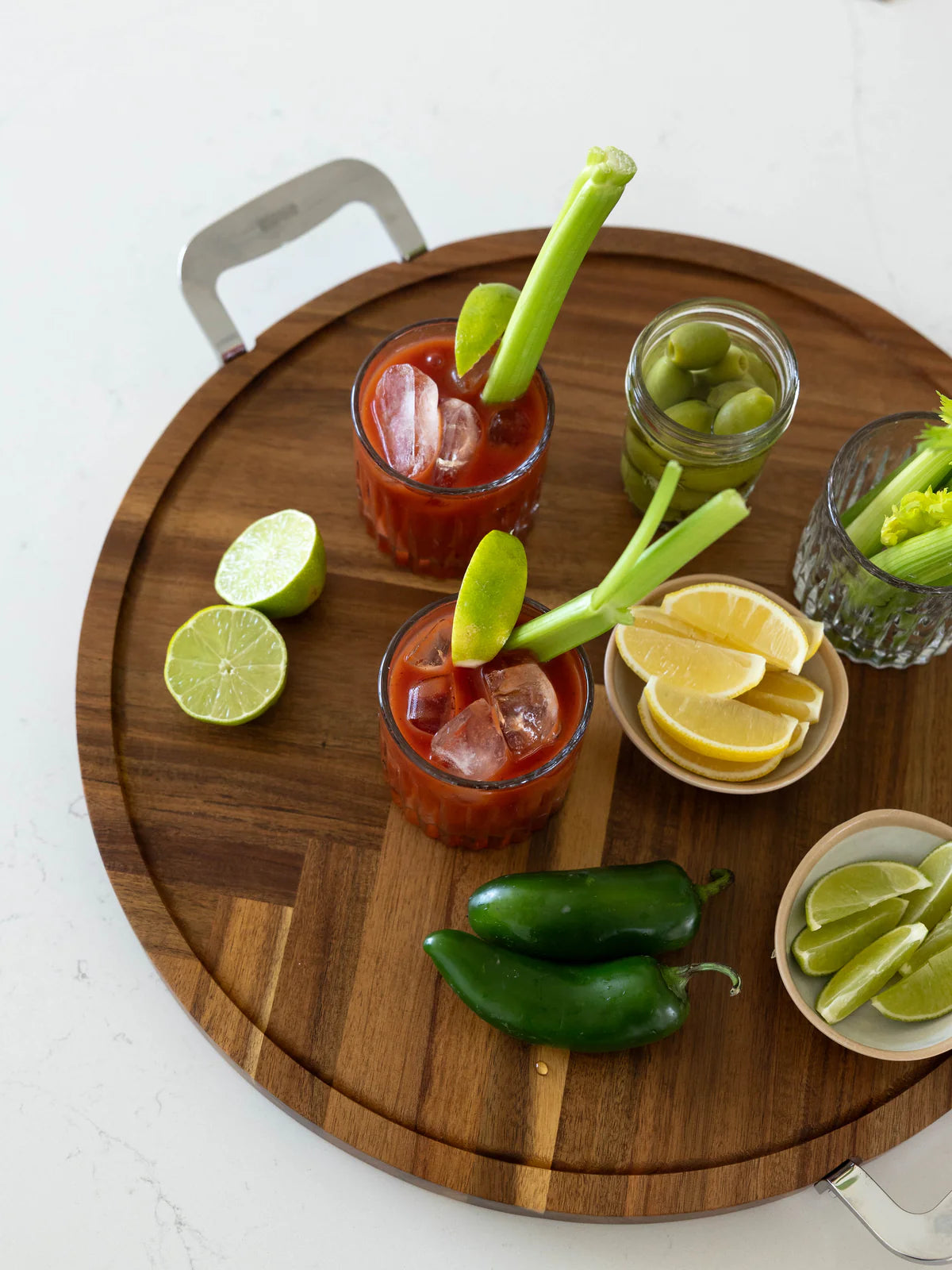 This striking serving board features a decorative herringbone pattern, sleek stainless-steel handles for easy transport, and raised edges to keep food securely on the board & prevent spills. Ideal for charcuterie, appetizers, & hosting of all kinds!