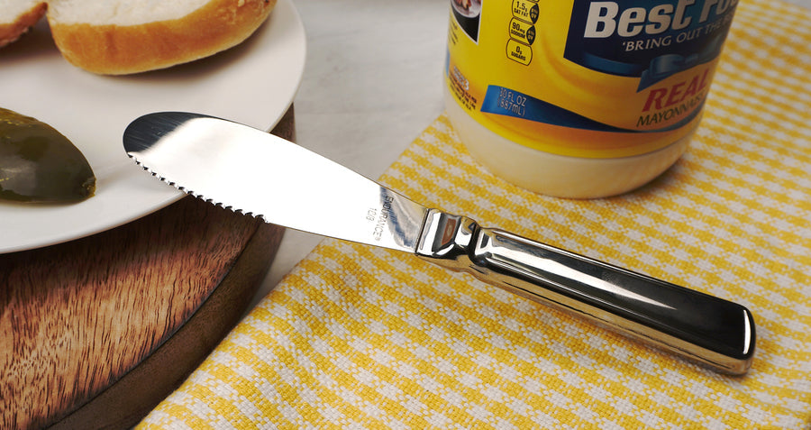 Serrated edge for harder spreads.