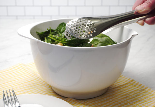 These highly functional straining tongs are perfect for a variety of tasks in the kitchen and at the buffet table. Designed with holes at the tips, they are ideal for pulling cooked pasta or dumplings from boiling water, and also make attractive salad tongs. Made of dishwasher safe stainless steel. 10″ overall length.