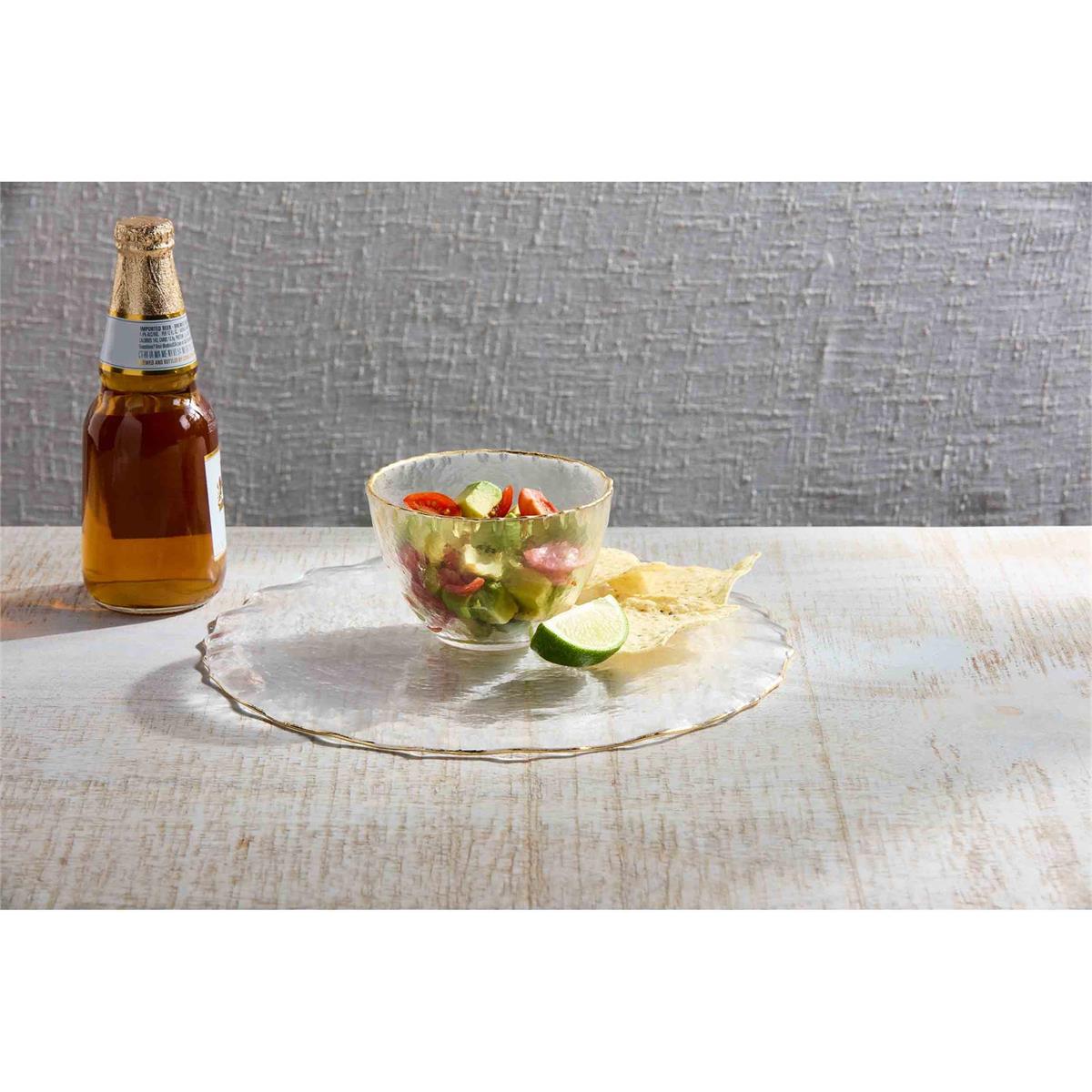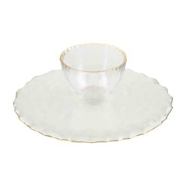 Our Glass Reversible Chip and Dip Set is a remarkable serving piece designed to elevate your dining experience. Crafted from exquisite glass with a luxurious gold edge, this set seamlessly combines elegance and functionality. Its unique design features an integrated center dip cup, allowing for effortless serving and stylish presentation. To add versatility, simply flip the server over to transform it into a pedestal server base. With a diameter of 11", the server offers ample space for chips, while the dip bowl measures 4 1/2" x 3", ensuring the perfect portion of dip for each bite. For maintenance, we recommend hand washing or gently cleaning with a damp cloth to preserve its pristine condition. Avoid soaking to extend its lifespan. Delight your loved ones with this magnificent gift, ideal for bridal showers and special occasions alike.
